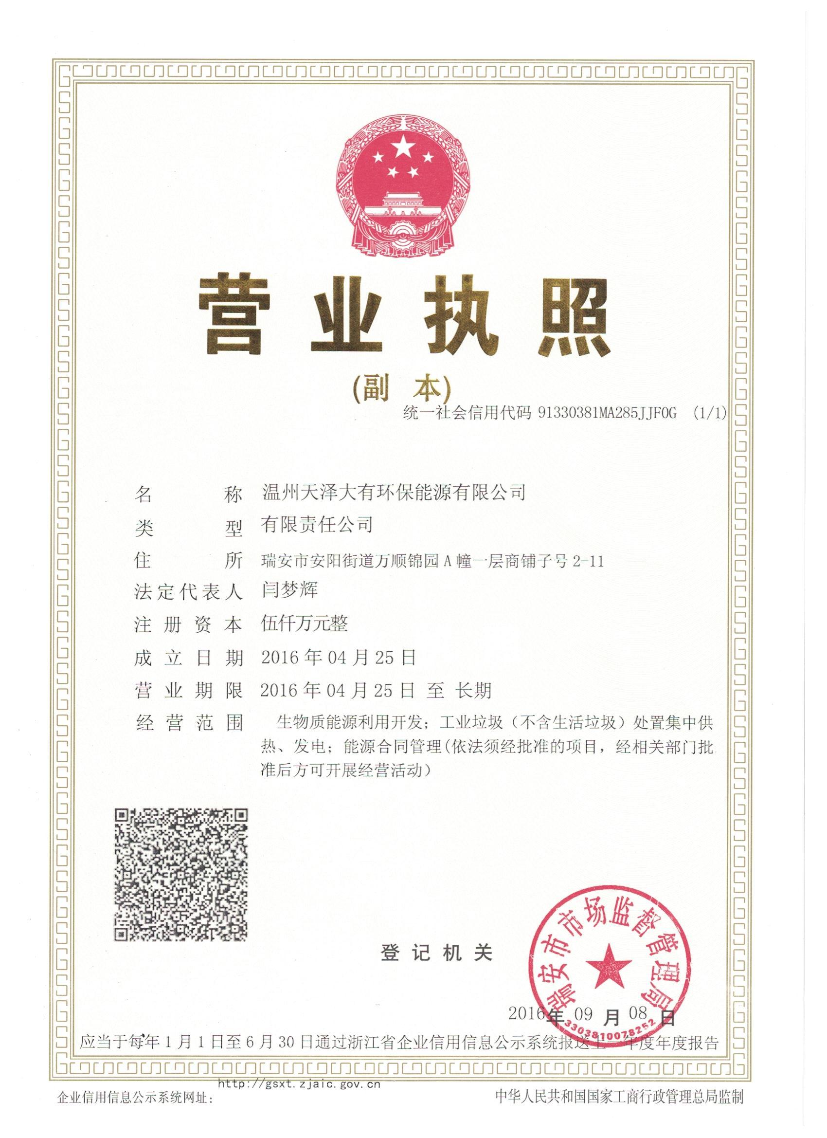浙江天泽大有环保能源有限公司由东华科技、瑞安涵之能源公司等10位股东共同设立,注册资本金1亿元,其中东华科技持股28%。经营范围包括生物质能源利用开发,工业垃圾及污泥(不含生活垃圾)、建筑垃圾、装修垃圾、秸秆处置集中供热、发电,能源合同管理等业务。